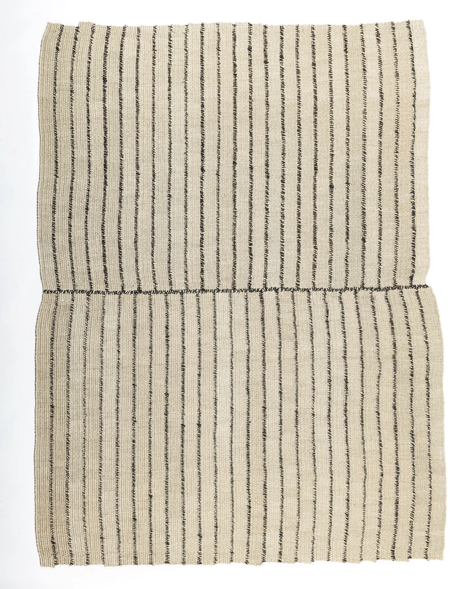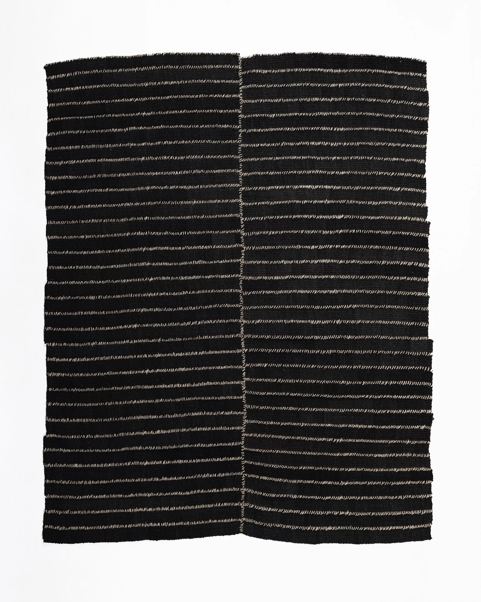 55” x 82” / hemp / 2021 : available for purchase through HUNT MODERN (This piece is shown on the left in its unfinished form - The loose colored ends along the edges represent the periods of time dedicated to weaving during each day’s ‘sit’ at the loom. The piece is woven in two panels..